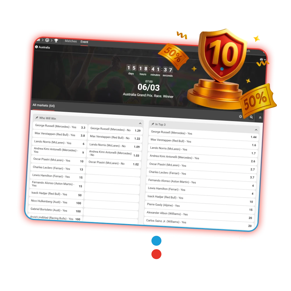You can place bets before qualifying, before the race, or during the action. Markets cover drivers, teams, and race events. The bet slip shows potential returns instantly, based on your stake and odds. Cash out may appear on selected markets.